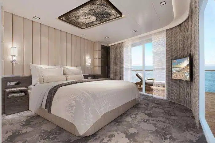 A modern, spacious cruise ship suite with a large angled window offering an expansive ocean view. The room features a plush gray sectional sofa, minimalist furniture, and a wall-mounted flat-screen television.